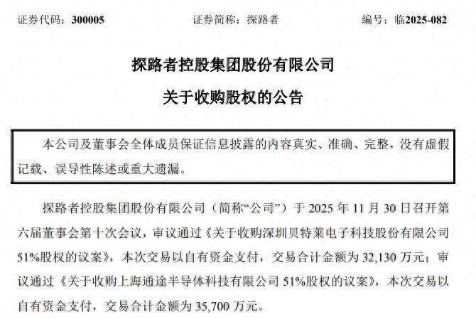 12月1日晚间,探路者(300005)抛出总额6.78亿元的收购方案。该公司公告称,拟以自有资金32,130万元收购深圳贝特莱电子科技股份有限公司(简称“贝特莱”)51%股权,以自有资金35,700万元收购上海通途半导体科技有限公司(简称“上海通途”)51%股权。交易完成后两家公司将成为控股子公司并纳入合并报表,且上述交易不构成关联交易,不构成重大资产重组。