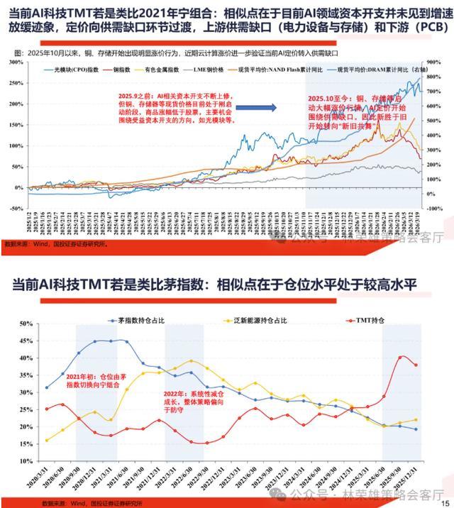 1、若后续宏观环境呈现温和通胀+强美元、全球经济具备韧性的特征,当前行情将更倾向于类比2021年3月,当前上证指数甚至有望在下半年创出新高。结构层面,资源品内部金融属性回落,商品属性回升是明确的,以黄金为代表的“2021年茅指数”将跑输;AI科技到底是“2021年茅指数”还是“2021年宁组合”核心支撑逻辑在于自身后续景气水平如何。若温和通胀导致流动性收紧并不影响AI科技资本开支水平,那我们依然选择相信AI科技将是“2021年宁组合”,否则鉴于当前高仓位水平则陷入被动。