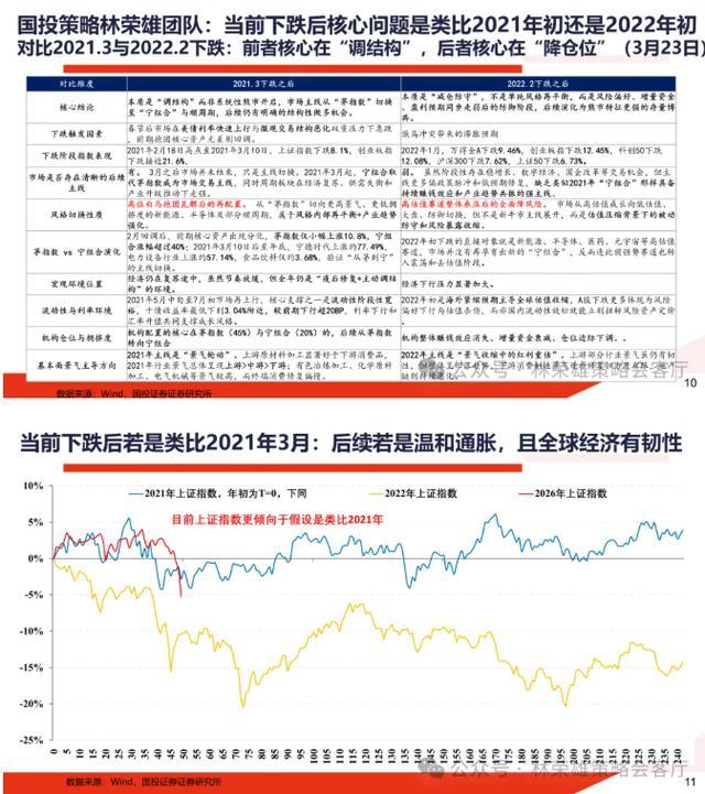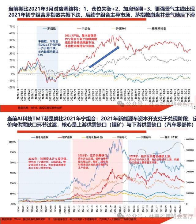 1、若类比2021年3月:面对年初下跌应对本质是调结构而非系统性下跌的开启,仓位失衡+加息预期+更强景气主线出现使得宁组合在后续替代了茅指数。