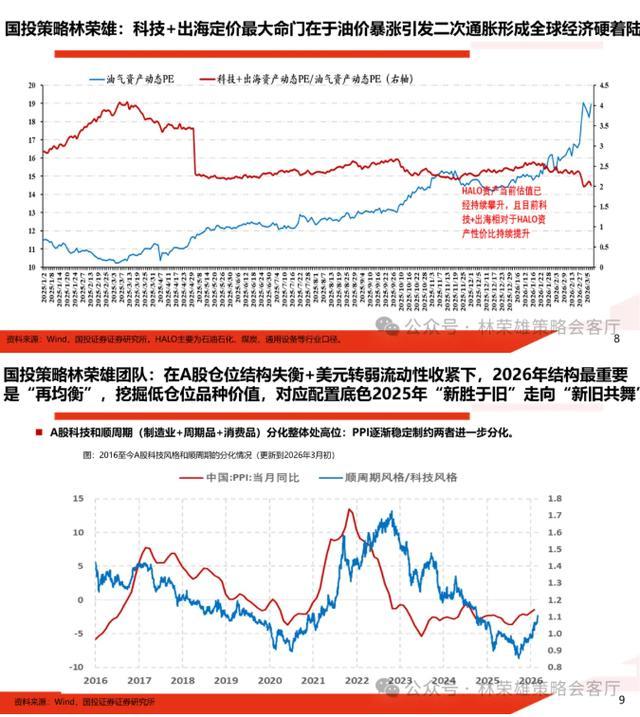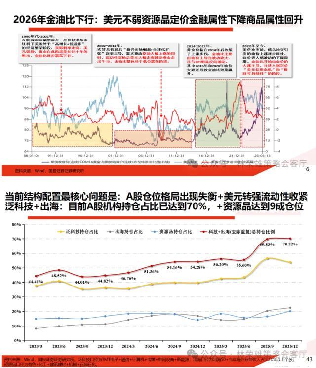 核心结论:当前 A 股市场正面临两大不可忽视的底层逻辑变化:1、内部仓位的结构失衡;2、宏观环境的巨大变化。前者指的是截至去年Q4,泛科技机构仓位已经超过50%,加出海超过7成,再加资源品接近9成,科技+出海+资源处于高仓位状态使得对于利空极为敏感,而对利多敏感性下降;后者是高油价下美元由弱转强,油价中枢不可避免的上移使得流动性环境出现收缩。在两大重要变化同时存在的背景下,我们认为仓位格局不可能维持原来的状态,一轮声势浩大的“再均衡配置”(或者是高切低)难以避免,也注定有些品种再也回不去了,也意味着要勇于与过去三年受益于此前逻辑涨幅惊人且重仓的诸多品种作告别,这点是要做好充分心理准备的。