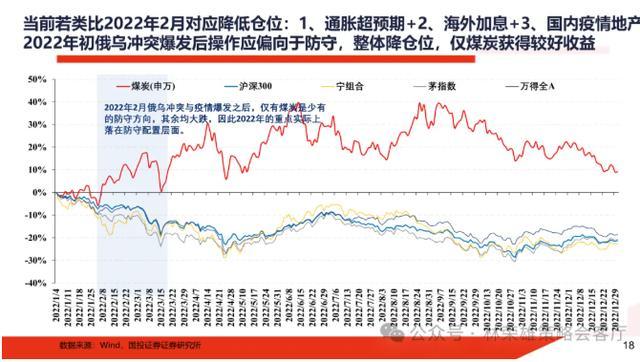 2、若类比2022年2月:面对年初下跌应对本质则是减仓防守,并非单纯调结构再均衡。2022年的宏观环境为:1、通胀超预期。2、海外加息。3、国内疫情,地产价格持续下跌。由此使得风险偏好、增量资金、盈利预期同步走弱后的全面防御阶段。