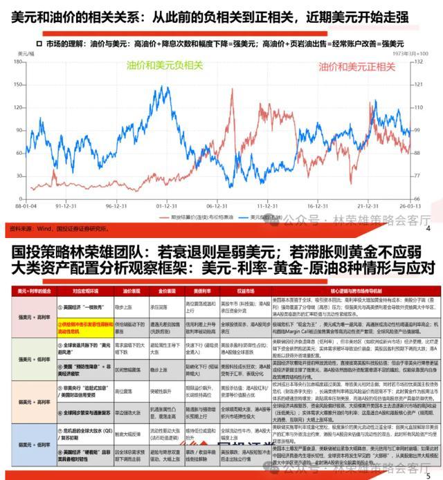 2、当前大类资产表现,强美元是最重要的定价抓手。眼下呈现”强油价+美债相对高利率+大幅滑落的黄金+相对强的美元”的组合,若是衰退定价,美元不会强;若是滞胀定价,黄金不应掉这么快,至少说明眼下不完全是典型滞胀或者衰退定价。所以,高油价下持续强美元弱黄金目前看不是坏事,若高油价下美元突然转弱黄金转强那麻烦还大了。