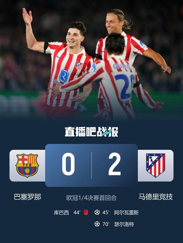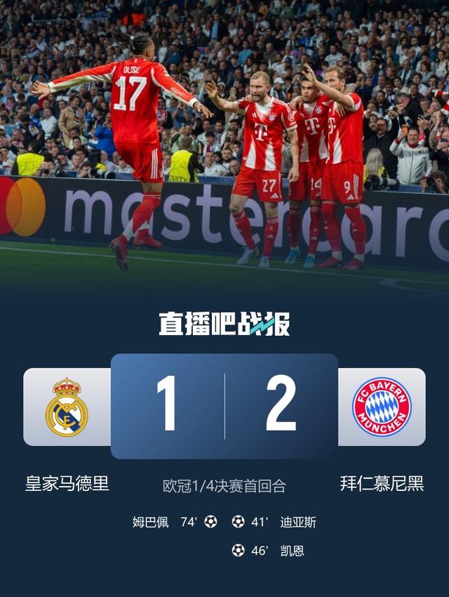 直播吧04月09日讯 欧冠1/4决赛首回合结束,巴萨0-2马竞,皇马则1-2拜仁。